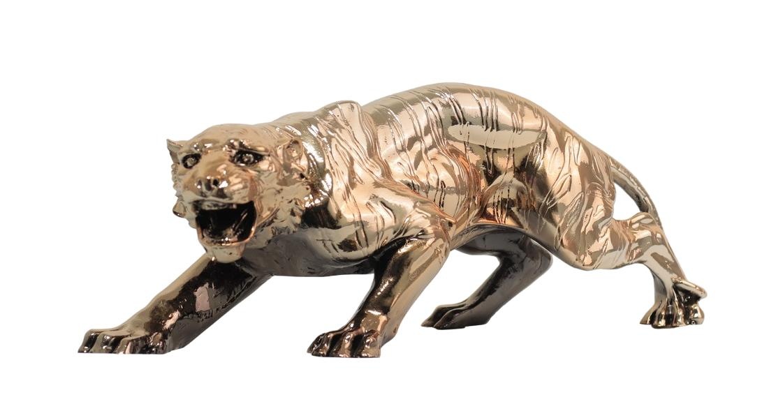 Den moderna dekorativa panterfiguren på 46 cm förenar tidlös elegans med en djärv design. Skapad i en strålande guldton, fungerar den som ett distinkt fokus för varje rum. Dess slanka linjer och stiliserade form ger en känsla av rörelse och liv, vilket förhöjer den exklusiva atmosfären i ditt hem. Varje detalj är noggrant utformad för att återspegla en livsstil av lyx och smakfullhet. Denna panterfigur är inte bara en dekoration; den är en symbol för sofistikering och en konstnärlig uttalande som kompletterar din inredning. Välj detta exceptionella verk för att förvandla ditt utrymme till en oas av stil och prestige.