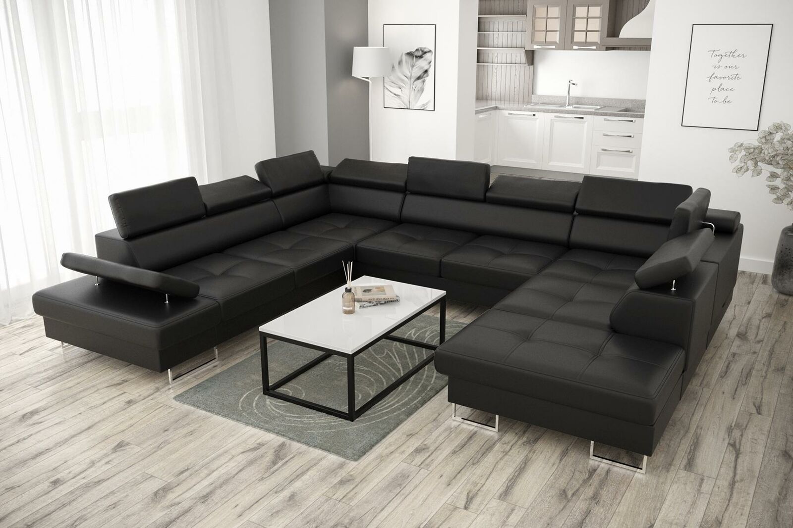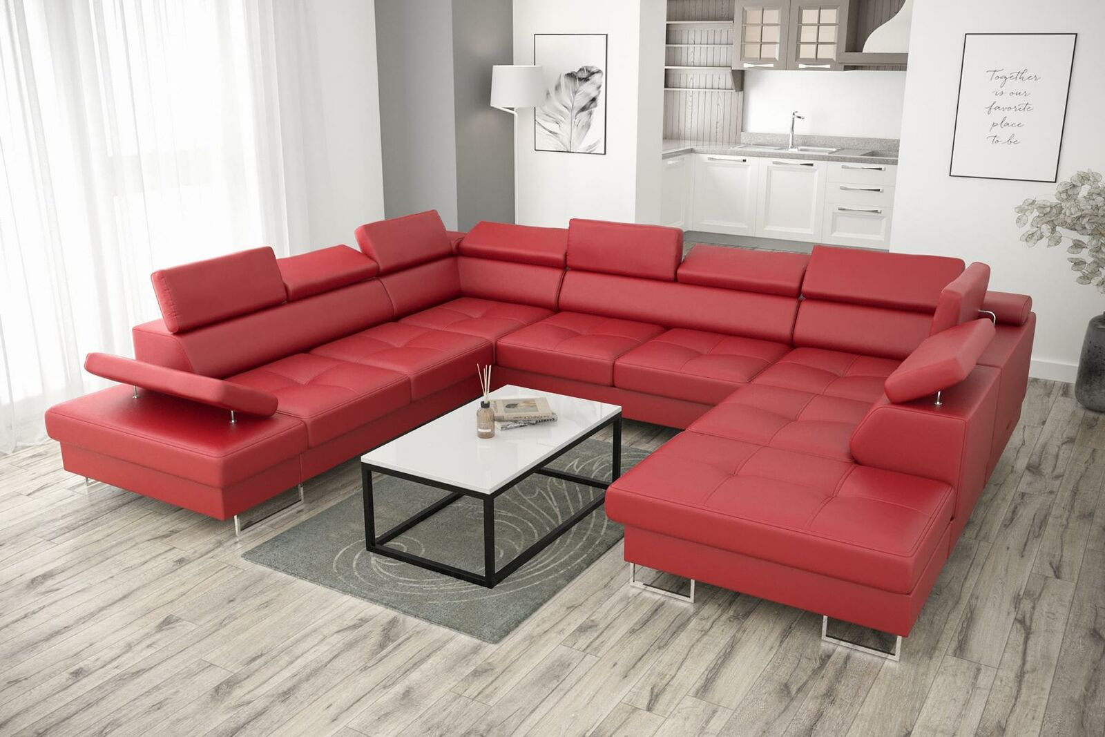 Holen Sie sich jetzt die perfekte Wohnlandschaft mit unserem Ecksofa in U-Form! Das gemütliche XL Möbelstück ist in verschiedenen Größen und Farben erhältlich, von Zyan über Burgunderrot bis hin zu Schwarz und Weiß. Sie haben die Qual der Wahl! Die Maße des Sofas betragen ca. 350 x 280/220 x 98 cm, und mit einer Sitztiefe von ca. 56 cm sowie einer Sitzhöhe von ca. 43 cm bietet es genügend Platz zum Entspannen. Das Material können Sie selbst auswählen: Entscheiden Sie sich für Stoff aus Gruppe 1, Premium Kunstleder aus Gruppe III oder eine Kombination aus Stoff oder Premium Kunstleder aus Gruppe IV. Das Ecksofa verfügt außerdem über einen Bettkasten und optional können Sie gegen Aufpreis die Unterboden LED Beleuchtung hinzufügen. Das Innengestell besteht aus echtem Holz und verfügt über eine bequeme Federkernpolsterung. Gestalten Sie Ihr Wohnzimmer neu und machen Sie es zu einem gemütlichen Ort zum Verweilen mit unserer Wohnlandschaft in U-Form!