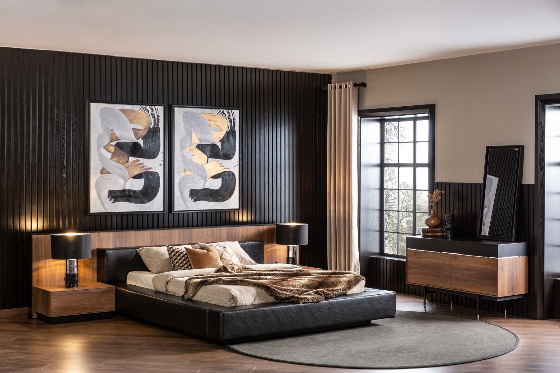 Detta 5-delars sovrumsmöbelset är en symbol för tidlös elegans och exklusivitet. Den stilfulla svarta finishen ger en modern och sofistikerad känsla, vilket gör varje detalj i ditt sovrum till en fröjd för ögat. Setet inkluderar en säng som lovar en oöverträffad sömnupplevelse, nattduksbord som erbjuder praktisk förvaring med stil, samt en byrå som kombinerar funktionalitet med en minimalistisk design. Varje komponent är noggrant utformad för att harmonisera med ett exklusivt hem, vilket speglar en livsstil av högsta kvalitet. Med 20 års erfarenhet av lyxmöbler är detta set en investering i både skönhet och komfort, perfekt för den som värdesätter det finare i livet.