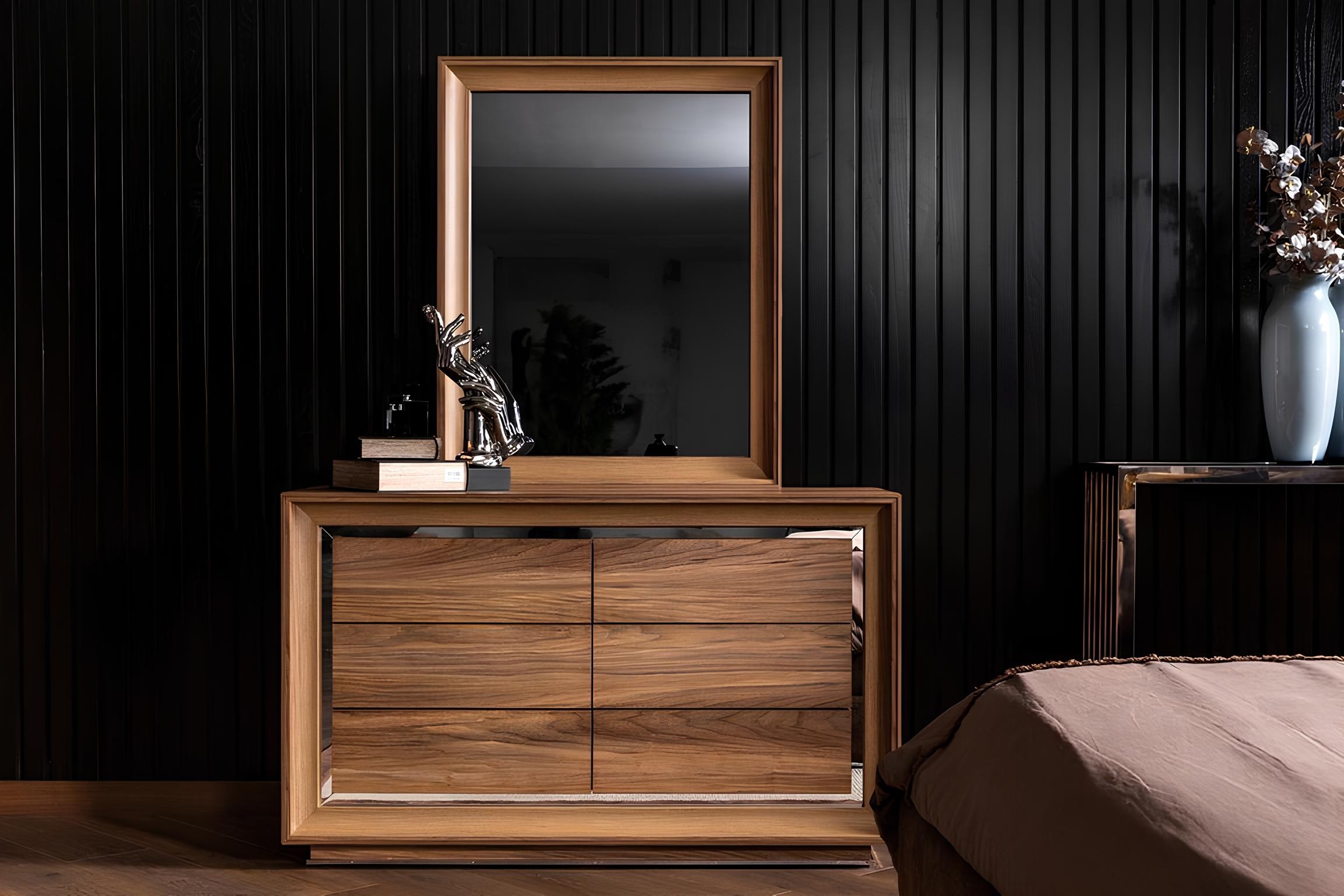 Detta ideala sovrumsmöbelset förenar stil och funktionalitet i en perfekt harmoni. Bestående av en elegant garderob, ett sofistikerat nattduksbord och en majestätisk säng, erbjuder detta femdelade set en oöverträffad upplevelse av lyx och komfort. Den rika bruna nyansen tillför värme och karaktär, medan de noggrant utvalda materialen säkerställer hållbarhet och tidlöshet. Varje detalj är designad för att skapa en exklusiv atmosfär, vilket gör det till den perfekta investeringen för den som värdesätter elegans i sitt hem. Med över 20 års erfarenhet av lyxmöbler erbjuder vi en unik möjlighet att förvandla ditt sovrum till en fristad av stil och välbefinnande.