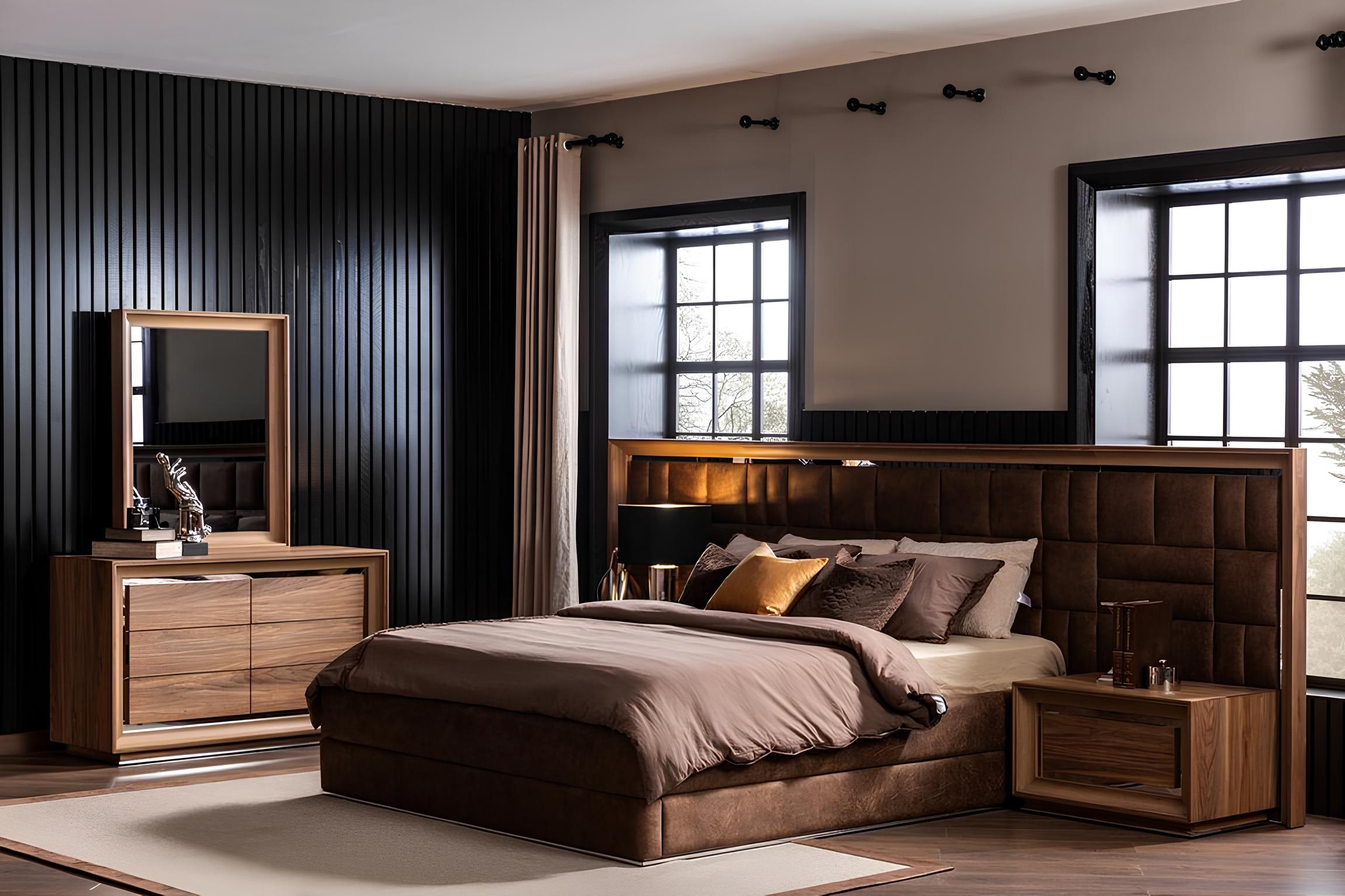 Sovrumsmöbelset med säng + lyxiga nattduksbord i brunt | xlmobler.se