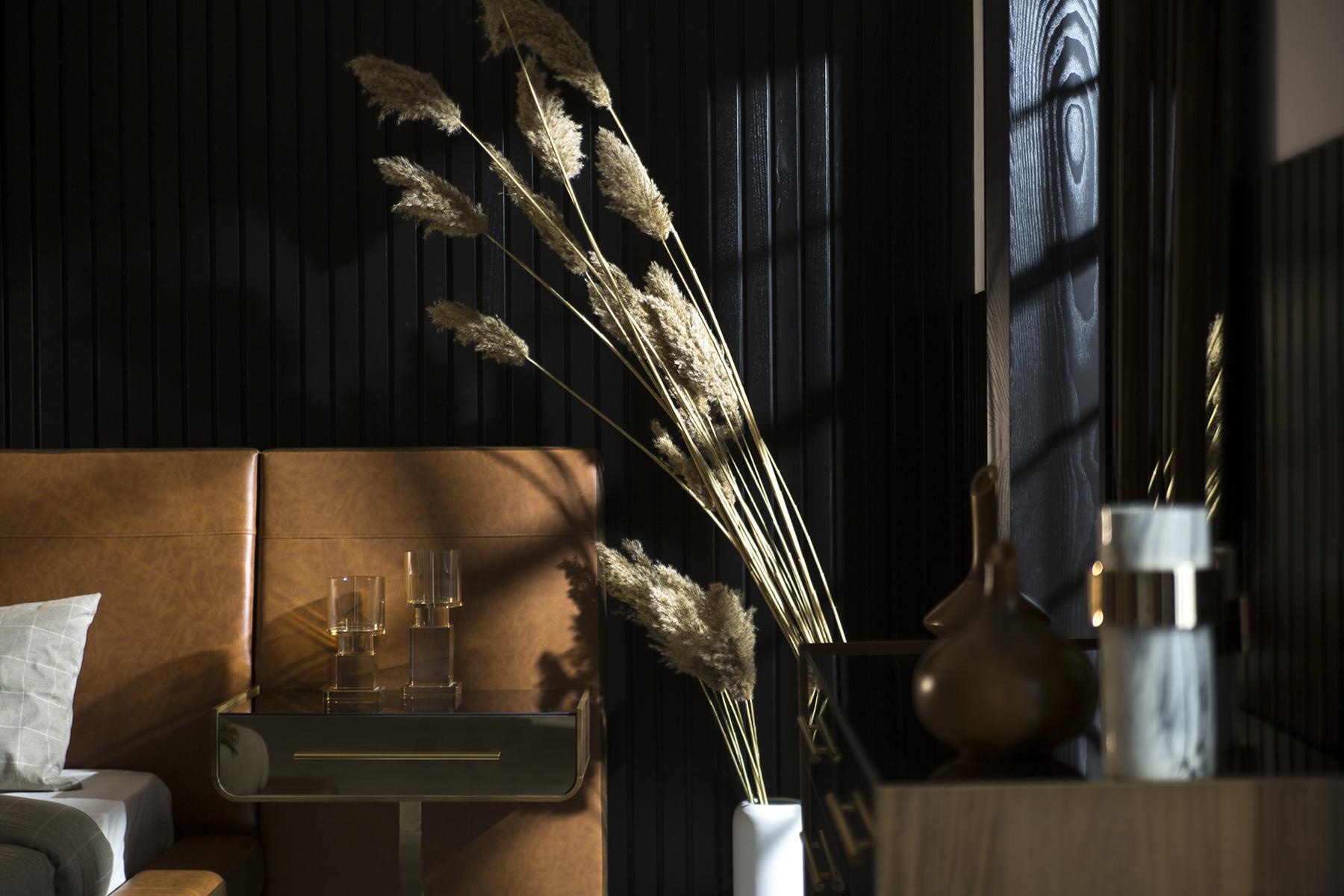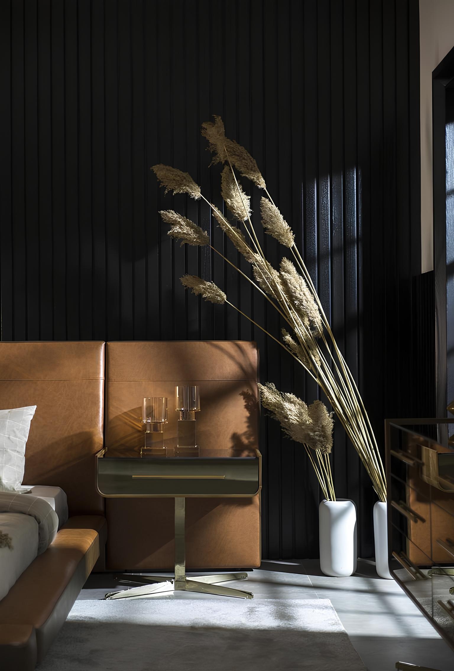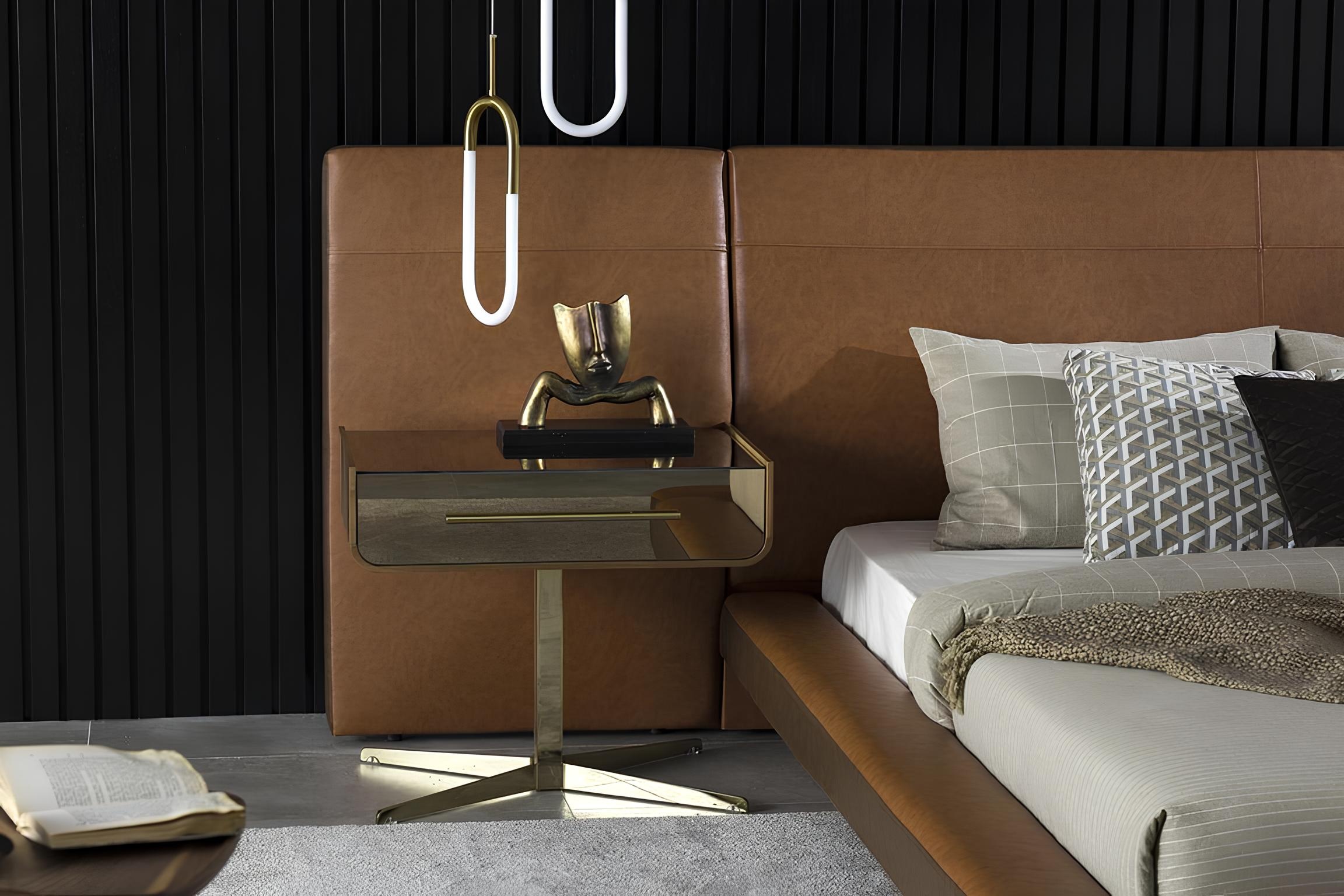 Säng med design och två nattygsbord i glas | xlmobler.se