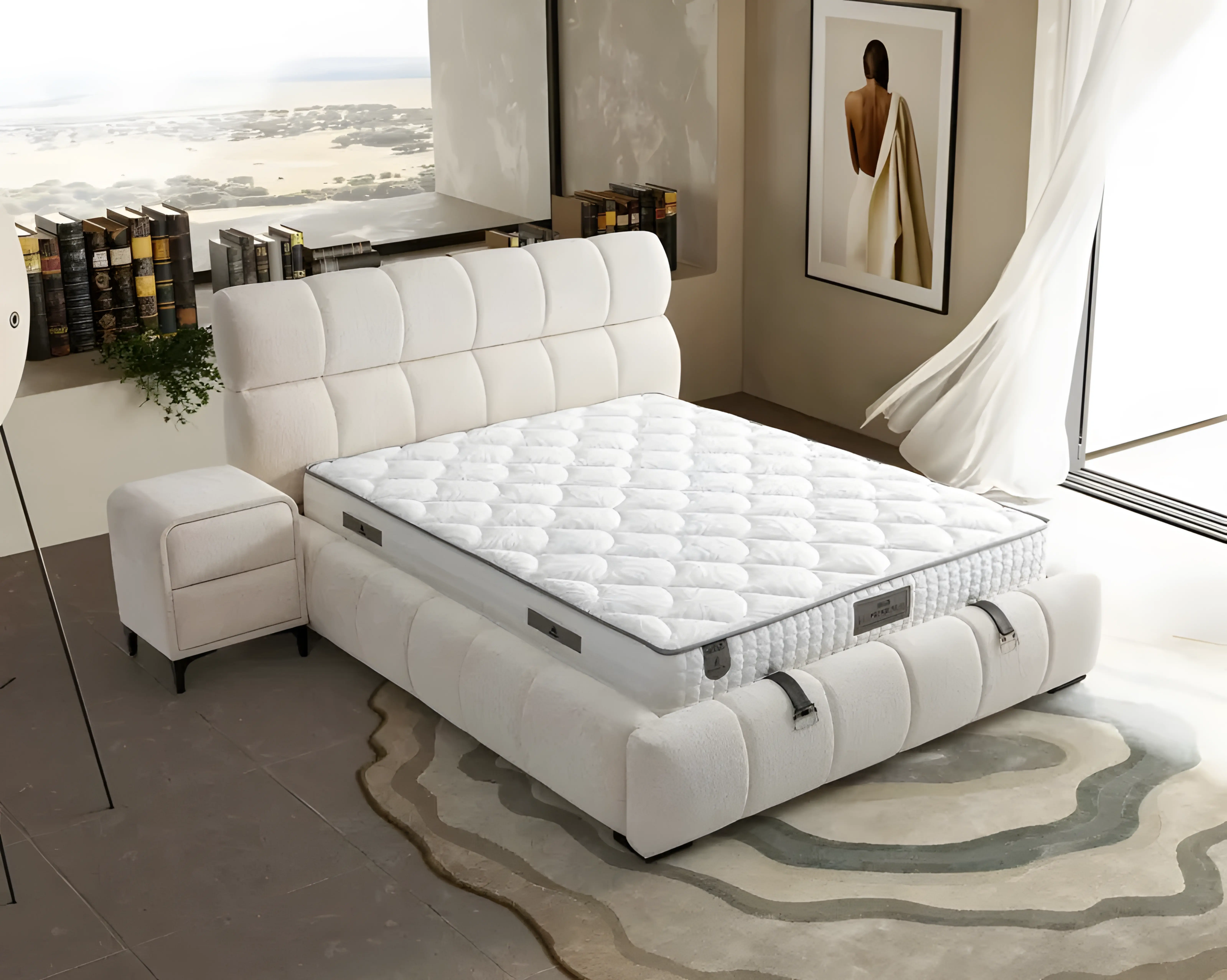 Den eleganta blå tyg och trä sängen med madrass förenar tidlös design med högsta komfort. Den vita trästommen utstrålar en subtil elegans och förvandlar varje sovrum till en fristad av stil. Det blå tyget, noggrant utvalt för sin lyxiga känsla och hållbarhet, kompletterar den minimalistiska estetik som kännetecknar vår kollektion. Sängen erbjuder en perfekt balans mellan stöd och mjukhet, vilket garanterar en god natts sömn. Med två decennier av erfarenhet inom exklusiv möbeldesign, är denna säng ett utmärkt val för den som värdesätter kvalitet och stil. Låt den bli en centralpunkt i ditt hem och förhöja din livskvalitet med en touch av sofistikation.