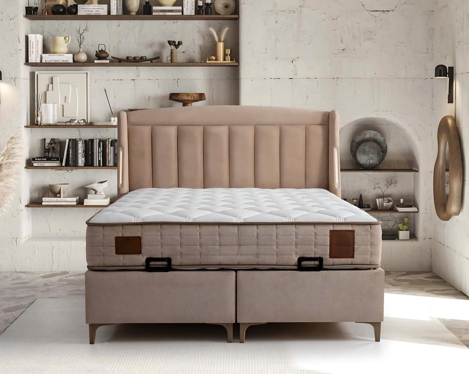 Den eleganta sängen i trä med tyg- och trämatta är en symbol för tidlös lyx och raffinerad smak. Tillverkad av högkvalitativt brunt trä, erbjuder denna säng en harmonisk balans mellan naturlig skönhet och funktionalitet. Dess mjuka linjer och genomtänkta design skapar en inbjudande atmosfär, perfekt för den som värdesätter stil och komfort. Varje detalj är noggrant utformad för att förhöja din sovupplevelse och bidra till en exklusiv livsstil. Med över 20 års erfarenhet av att skapa möbler av högsta kvalitet, är denna säng ett självklart val för det eleganta hemmet. Låt denna säng bli den centrala punkten i ditt sovrum, där drömmar får blomma ut i en miljö av fulländad stil.