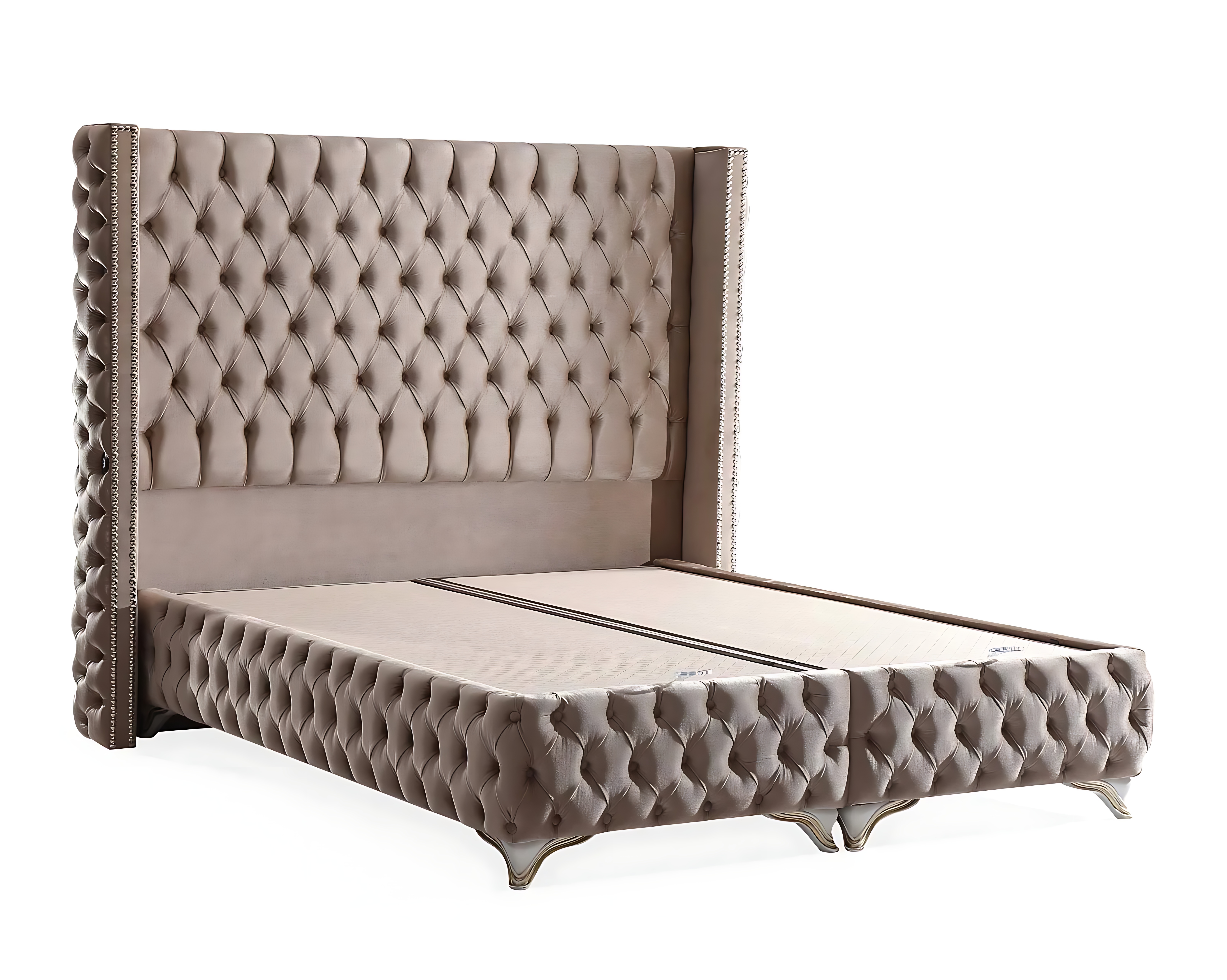 Sängen Elegant med brun tyg förenar tidlös design och överlägsen komfort, vilket gör den till en oumbärlig del av ett exklusivt hem. Den ljusa beigea trästrukturen ger en subtil elegans som harmoniserar med varje inredning. Det noggrant utvalda tyget skapar en inbjudande atmosfär, perfekt för avkoppling och återhämtning. Med sin generösa storlek erbjuder sängen en oöverträffad sovupplevelse, där kvalitet och stil går hand i hand. Efter 20 år av att erbjuda lyxiga möbler är denna säng en symbol för vårt engagemang för det bästa, och den är utformad för att förvandla ditt sovrum till en fristad av sofistikation och stil.