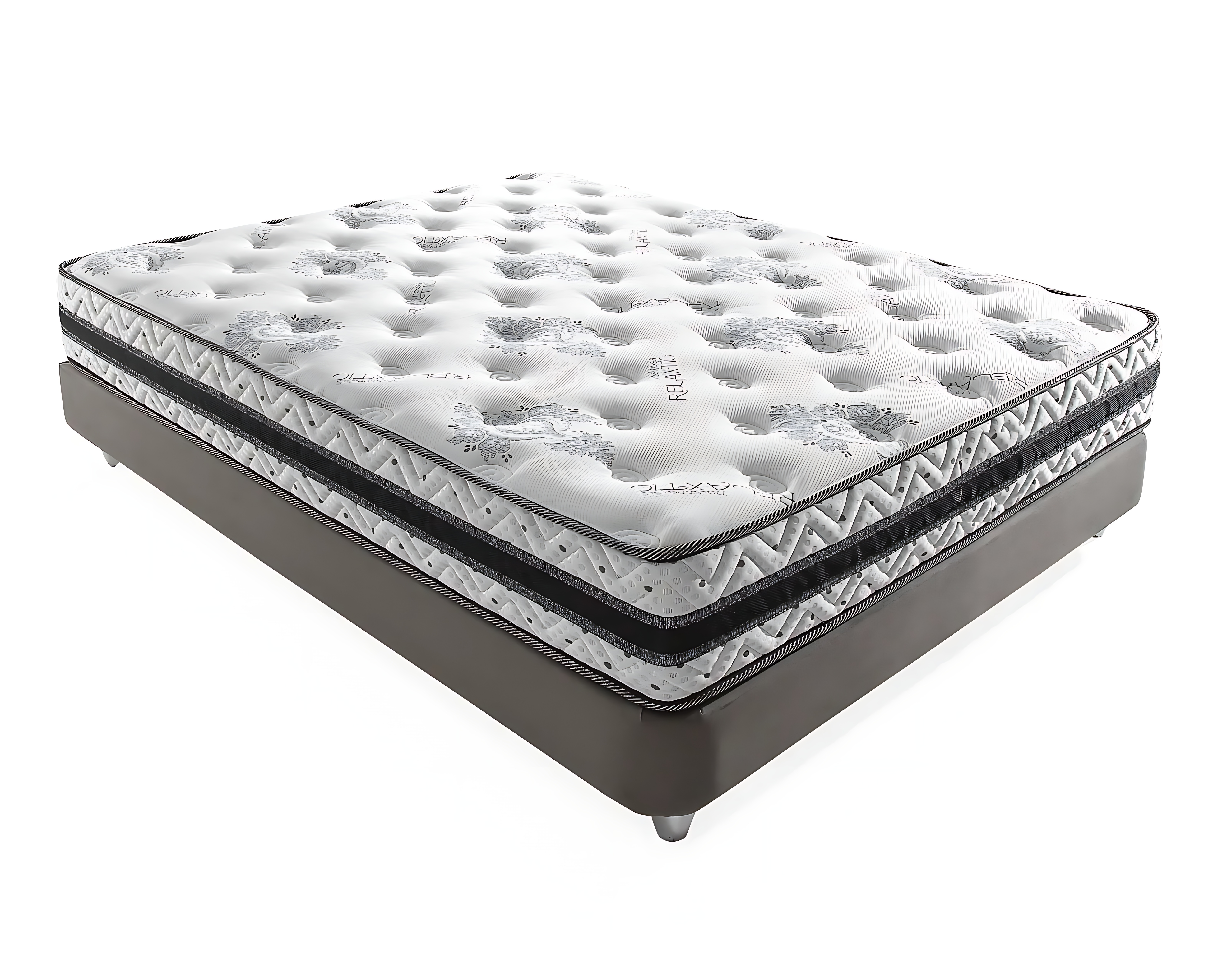 Säng med elegant design och madrass skapar en trevlig atmosfär.