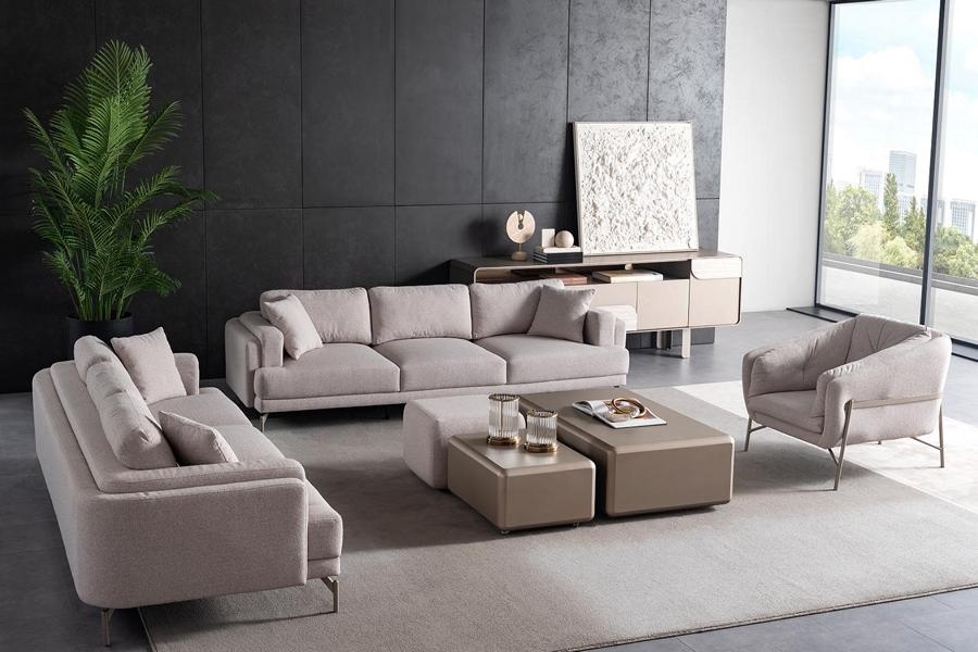 Beige vardagsrumset med modern soffa och fåtölj