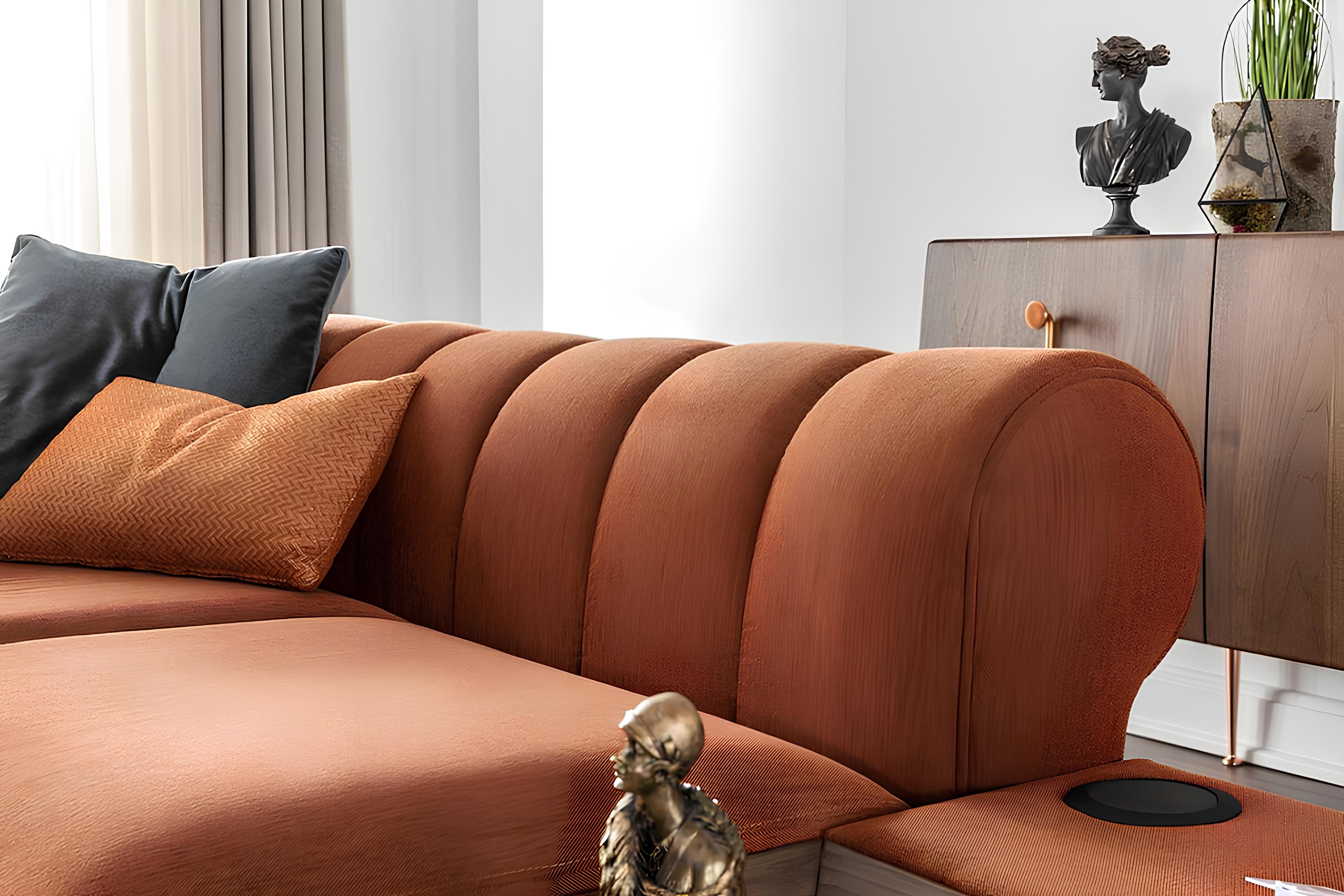 Den moderna soffan i orange tyg för två personer, med en generös längd av 234 cm, är en verklig manifestation av stil och förfining. Tillverkad av högkvalitativ polyester, erbjuder den en lyxig känsla och en djärv färg som förvandlar varje rum till en elegant oas. Denna soffa är designad för att harmonisera med ett exklusivt hem, där komfort och estetik går hand i hand. Med sin skarpa design och omsorgsfulla detaljer är den ett centralt inslag i varje vardagsrum. Oavsett om den används för avkoppling eller sociala tillställningar, förhöjer den den omgivande atmosfären och blir en symbol för en sofistikerad livsstil. Välj denna soffa för att uttrycka din unika smak och skapa en inbjudande miljö.