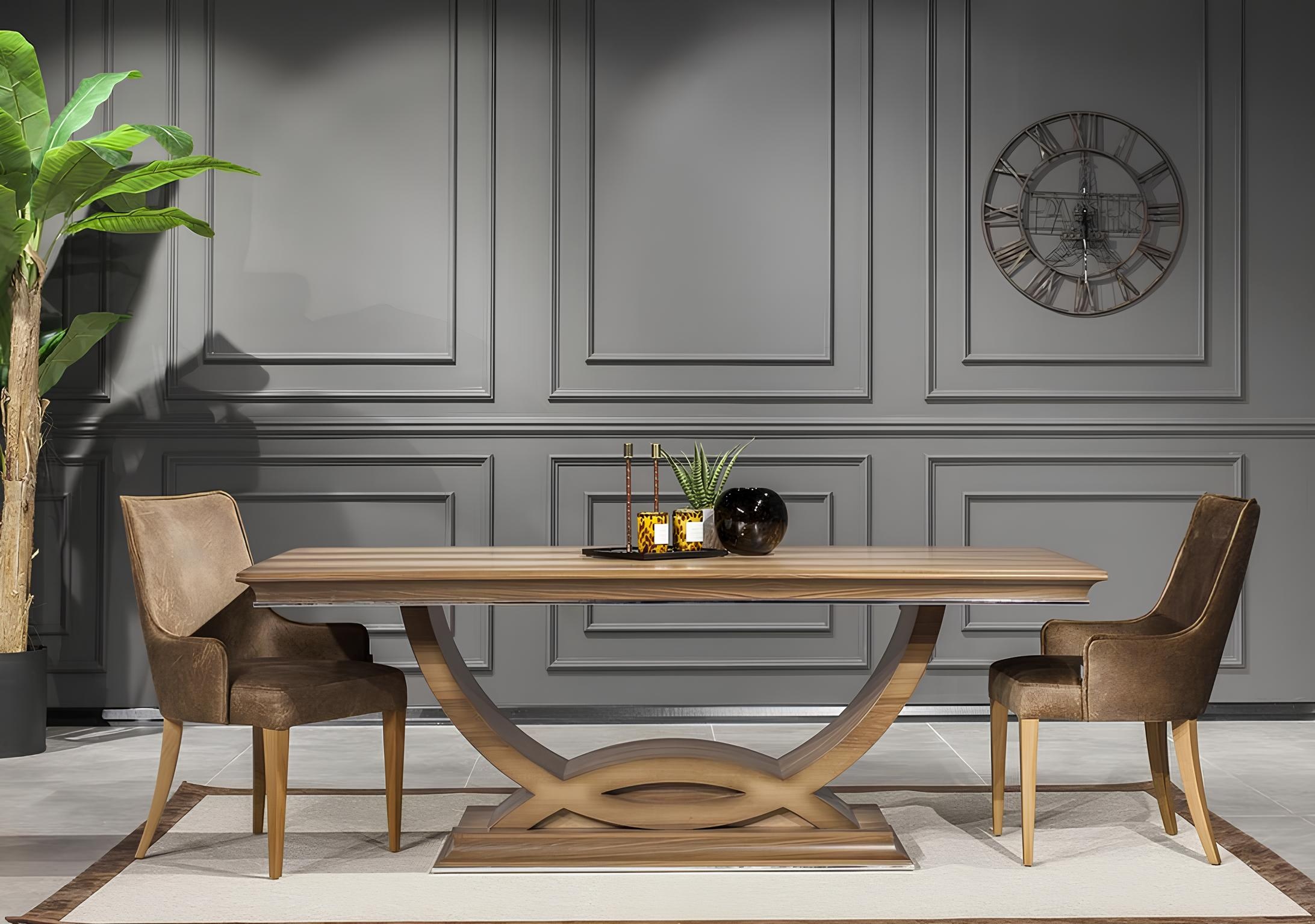 Det lyxiga matbordsetet i brunt polyester förenar tidlös elegans med exceptionell funktionalitet. Bestående av ett generöst matbord och sex stiliga stolar, samt ett elegant nattduksbord, erbjuder detta 7-delars set en komplett lösning för den smakfulla hemmaanpassningen. Den rika bruna nyansen förhöjer atmosfären i varje rum, medan det noggrant utformade materialet skapar en känsla av sofistikerad komfort. Varje detalj är genomtänkt för att spegla en exklusiv livsstil, perfekt för både formella middagar och avkopplande stunder. Med 20 års erfarenhet inom lyxmöbler är detta set en investering i skönhet och hållbarhet, ett oumbärligt tillskott till ditt hem.