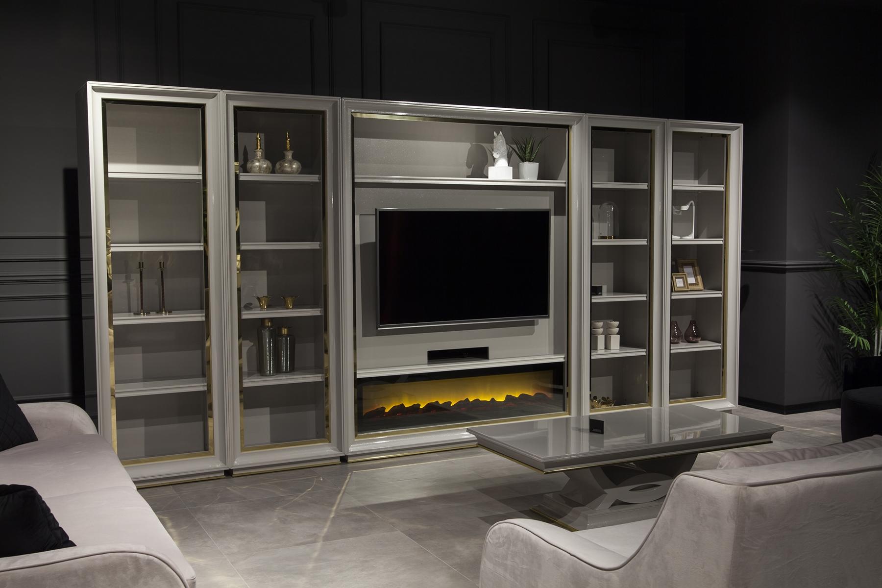XXL vägghylla för vardagsrum med eldstadsdesign