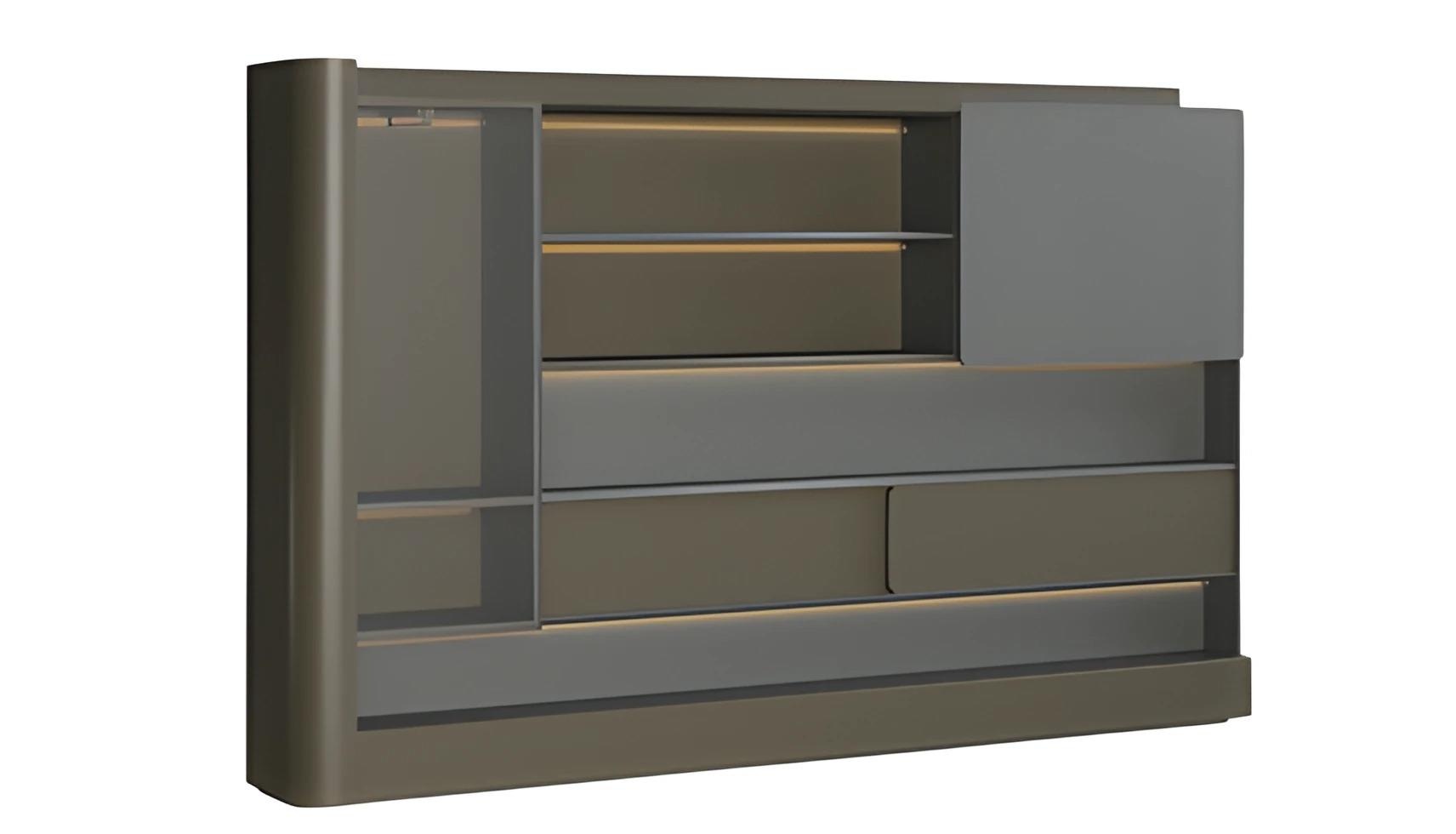 Det moderna svarta skrivbordet med grå LED-belysning och förvaringsutrymme förenar stil och funktionalitet på ett enastående sätt. Dess eleganta svarta yta ger en sofistikerad känsla, medan den subtila LED-belysningen skapar en atmosfär av lugn och fokus. Det väl genomtänkta förvaringsutrymmet erbjuder en praktisk lösning för att hålla din arbetsplats organiserad och minimalistisk. Detta skrivbord är mer än en möbel; det är en symbol för en exklusiv livsstil och en investering i ditt hem. Med över 20 års erfarenhet inom lyxmöbler, erbjuder vårt varumärke en unik design som förhöjer varje rum och sätter en standard för elegans och kvalitet.