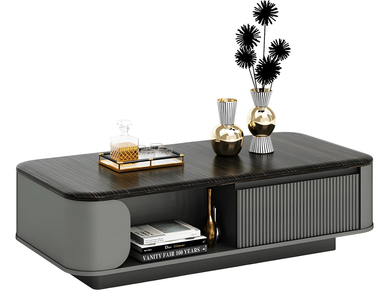 Det moderna soffbordet med sin eleganta design erbjuder en perfekt balans mellan funktion och stil. Den svarta skivan, med sin släta och sofistikerade yta, ger ett uttryck av tidlöshet och lyx. De öppna hyllorna skapar en inbjudande atmosfär, idealisk för att framhäva dina mest älskade inredningsdetaljer. Med en noggrant genomtänkt konstruktion och kvalitet som kännetecknar vårt varumärke, som har erbjudit exklusiv möbeldesign i 20 år, blir detta soffbord en centralpunkt i ditt hem. Det är mer än bara ett möbelstycke; det är en symbol för en exklusiv livsstil och en investering i det vackra. Välj detta soffbord för att fullända din inredning med en touch av elegans.